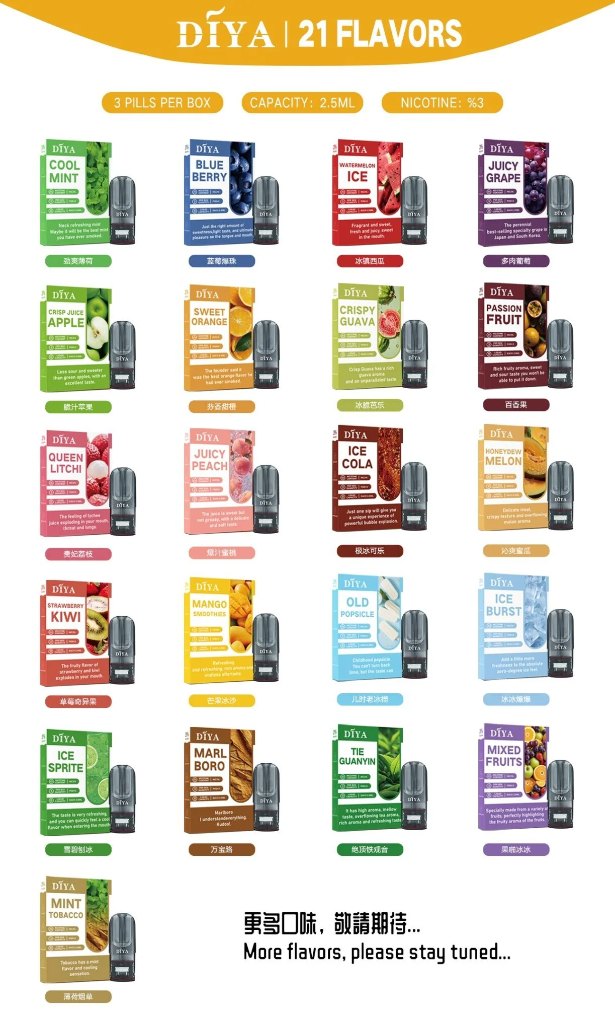 | DIYA叮啞一代通用煙彈 | 兒時老冰棍, 冰冰爆爆, 冰清玉露, 冰脆芭樂, 冰鎮西瓜, 勁爽薄荷, 多肉葡萄, 果啪冰冰, 極冰可樂, 沁爽蜜瓜, 爆汁蜜桃, 百香果, 絕頂鐵觀音, 脆汁蘋果, 芒果冰沙, 芬香甜橙, 草莓奇異果, 萬寶路, 薔薇布林, 藍莓爆珠, 貴妃荔枝, 雪碧刨冰 |